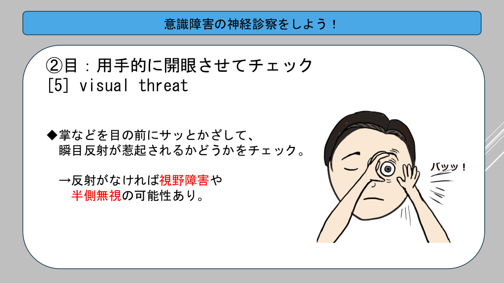 #12. 意識障害の神経診察をしよう! ②目:用手的に開眼させてチェック [5] visual threat ◆掌などを目の前にサッとかざして、 瞬目反射が惹起されるかどうかをチェック。 バッッ! →反射がなければ視野障害や 半側無視の可能性あり。