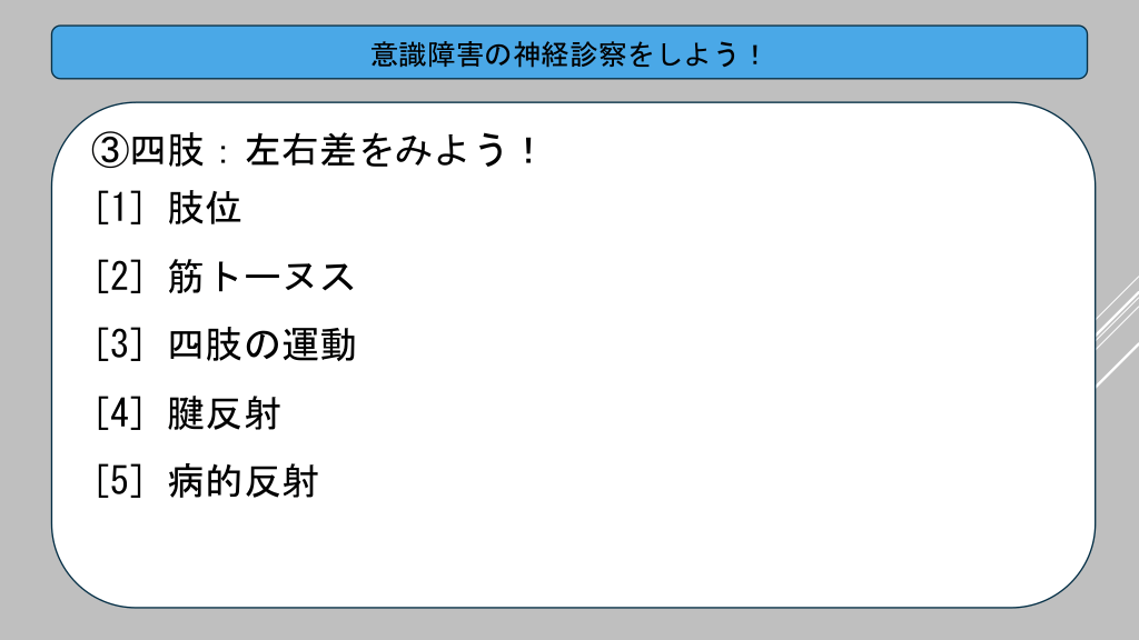 #13. 意識障害の神経診察をしよう! ③四肢:左右差をみよう! [1] 肢位 [2] 筋トーヌス [3] 四肢の運動 [4] 腱反射 [5] 病的反射
