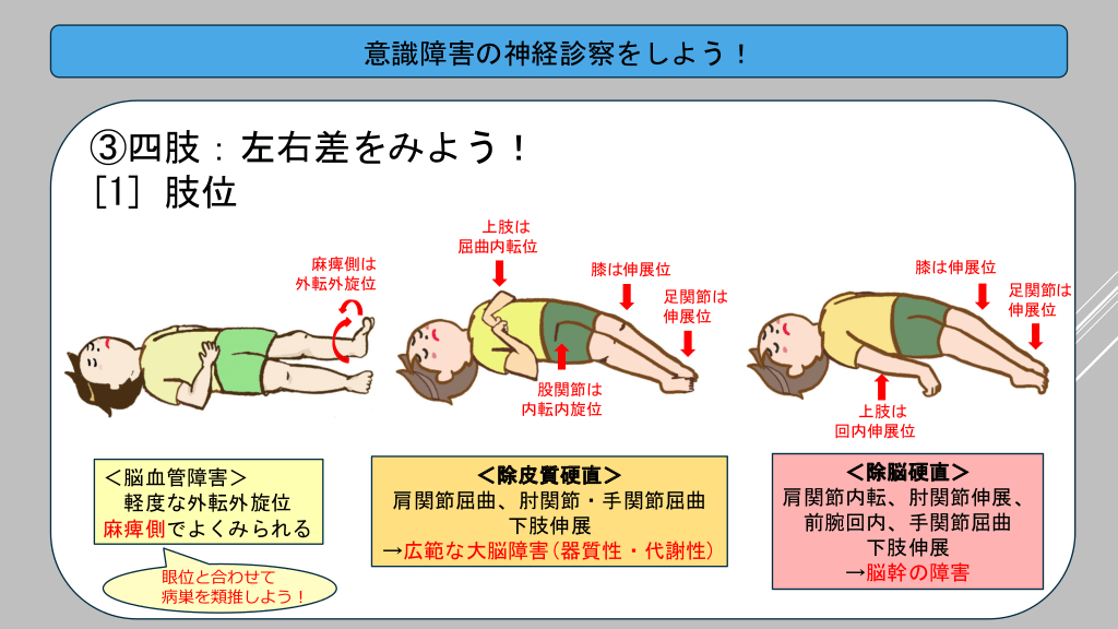 #14. 意識障害の神経診察をしよう! ③四肢:左右差をみよう! [1] 肢位 上肢は 屈曲内転位 麻痺側は 外転外旋位 ⑥右下肢だけ やや外転外旋位で 眠っている人の図 膝は伸展位 ⑦徐皮質硬直の図 (無料イラスト見つからず) 眼位と合わせて 病巣を類推しよう! 足関節は 伸展位 足関節は 伸展位 股関節は 内転内旋位 <脳血管障害> 軽度な外転外旋位 麻痺側でよくみられる 膝は伸展位 <除皮質硬直> 肩関節屈曲、肘関節・手関節屈曲 下肢伸展 →広範な大脳障害(器質性・代謝性) 上肢は 回内伸展位 <除脳硬直> 肩関節内転、肘関節伸展、 前腕回内、手関節屈曲 下肢伸展 →脳幹の障害