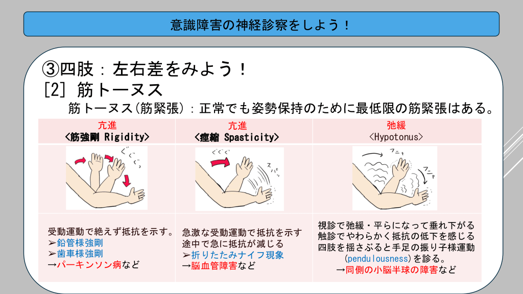 #15. 意識障害の神経診察をしよう! ③四肢:左右差をみよう! [2] 筋トーヌス 筋トーヌス(筋緊張):正常でも姿勢保持のために最低限の筋緊張はある。 亢進 <筋強剛 Rigidity> 受動運動で絶えず抵抗を示す。 ➢鉛管様強剛 ➢歯車様強剛 →パーキンソン病など 亢進 <痙縮 Spasticity> 急激な受動運動で抵抗を示す 途中で急に抵抗が減じる ➢折りたたみナイフ現象 →脳血管障害など 弛緩 <Hypotonus> 視診で弛緩・平らになって垂れ下がる 触診でやわらかく抵抗の低下を感じる 四肢を揺さぶると手足の振り子様運動 (pendulousness)を診る。 →同側の小脳半球の障害など