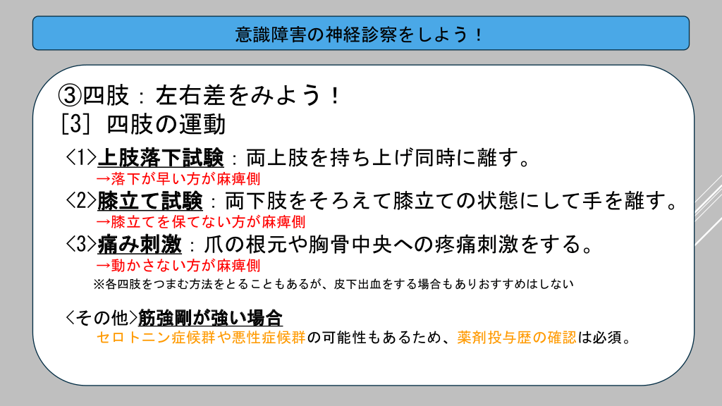 #16. 意識障害の神経診察をしよう! ③四肢:左右差をみよう! [3] 四肢の運動 <1>上肢落下試験:両上肢を持ち上げ同時に離す。 →落下が早い方が麻痺側 <2>膝立て試験:両下肢をそろえて膝立ての状態にして手を離す。 →膝立てを保てない方が麻痺側 <3>痛み刺激:爪の根元や胸骨中央への疼痛刺激をする。 →動かさない方が麻痺側 ※各四肢をつまむ方法をとることもあるが、皮下出血をする場合もありおすすめはしない <その他>筋強剛が強い場合 セロトニン症候群や悪性症候群の可能性もあるため、薬剤投与歴の確認は必須。