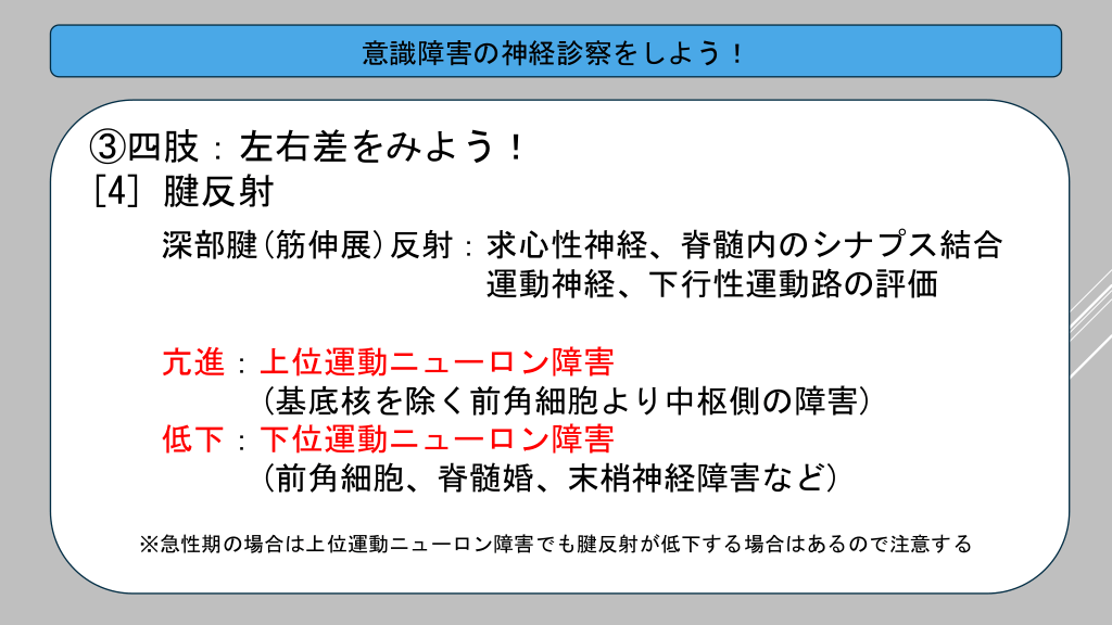 #17. 意識障害の神経診察をしよう! ③四肢:左右差をみよう! [4] 腱反射 深部腱(筋伸展)反射:求心性神経、脊髄内のシナプス結合 運動神経、下行性運動路の評価 亢進:上位運動ニューロン障害 (基底核を除く前角細胞より中枢側の障害) 低下:下位運動ニューロン障害 (前角細胞、脊髄婚、末梢神経障害など) ※急性期の場合は上位運動ニューロン障害でも腱反射が低下する場合はあるので注意する