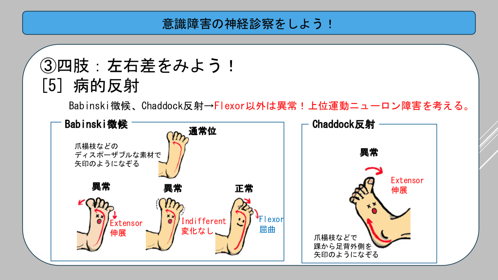 #18. 意識障害の神経診察をしよう! ③四肢:左右差をみよう! [5] 病的反射 Babinski徴候、Chaddock反射→Flexor以外は異常!上位運動ニューロン障害を考える。 Babinski徴候 Chaddock反射 通常位 爪楊枝などの ディスポーザブルな素材で 矢印のようになぞる 異常 Extensor 伸展 異常 異常 Indifferent 変化なし Extensor 伸展 正常 Flexor 屈曲 爪楊枝などで 踝から足背外側を 矢印のようになぞる