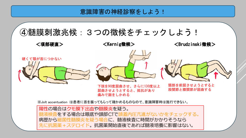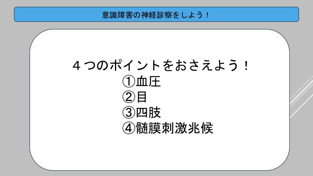 #5. 意識障害の神経診察をしよう! 4つのポイントをおさえよう! ①血圧 ②目 ③四肢 ④髄膜刺激兆候