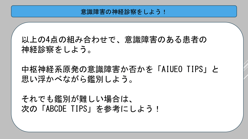 #20. 意識障害の神経診察をしよう! 以上の4点の組み合わせで、意識障害のある患者の 神経診察をしよう。 中枢神経系原発の意識障害か否かを「AIUEO TIPS」と 思い浮かべながら鑑別しよう。 それでも鑑別が難しい場合は、 次の「ABCDE TIPS」を参考にしよう!