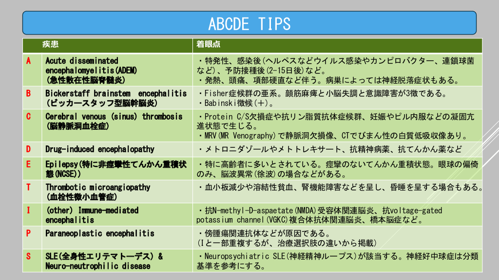 #21. ABCDE TIPS 疾患 着眼点 A Acute disseminated encephalomyelitis(ADEM) (急性散在性脳脊髄炎) ・特発性、感染後(ヘルペスなどウイルス感染やカンピロバクター、連鎖球菌 など)、予防接種後(2-15日後)など。 ・発熱、頭痛、項部硬直など伴う。病巣によっては神経脱落症状もある。 B Bickerstaff brainstem encephalitis (ビッカースタッフ型脳幹脳炎) ・Fisher症候群の亜系。顔筋麻痺と小脳失調と意識障害が3徴である。 ・Babinski徴候(+)。 C Cerebral venous (sinus) thrombosis (脳静脈洞血栓症) ・Protein C/S欠損症や抗リン脂質抗体症候群、妊娠やピル内服などの凝固亢 進状態で生じる。 ・MRV(MR Venography)で静脈洞欠損像、CTでびまん性の白質低吸収像あり。 D Drug-induced encephalopathy ・メトロニダゾールやメトトレキサート、抗精神病薬、抗てんかん薬など E Epilepsy(特に非痙攣性てんかん重積状 態(NCSE)) ・特に高齢者に多いとされている。痙攣のないてんかん重積状態。眼球の偏倚 のみ、脳波異常(徐波)の場合などがある。 T Thrombotic microangiopathy (血栓性微小血管症) ・血小板減少や溶結性貧血、腎機能障害などを呈し、昏睡を呈する場合もある。 I (other) Immune-mediated encephalitis ・抗N-methyl-D-aspaetate(NMDA)受容体関連脳炎、抗voltage-gated potassium channel(VGKC)複合体抗体関連脳炎、橋本脳症など。 P Paraneoplastic encephalitis ・傍腫瘍関連抗体などが原因である。 (Iと一部重複するが、治療選択肢の違いから掲載) S SLE(全身性エリテマトーデス) & Neuro-neutrophilic disease ・Neuropsychiatric SLE(神経精神ループス)が該当する。神経好中球症は分類 基準を参考にする。