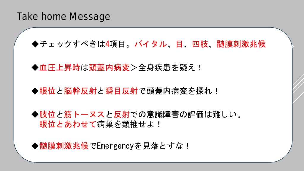 #22. Take home Message ①◆チェックすべきは4項目。バイタル、目、四肢、髄膜刺激兆候を見よ。 ②◆血圧上昇時は頭蓋内病変>全身疾患を疑え! ③◆眼位と脳幹反射と瞬目反射で頭蓋内病変を探れ! ④◆肢位と筋トーヌスと反射での意識障害の評価は難しい。 眼位とあわせて病巣を類推せよ! ⑤◆髄膜刺激兆候でEmergencyを見落とすな!