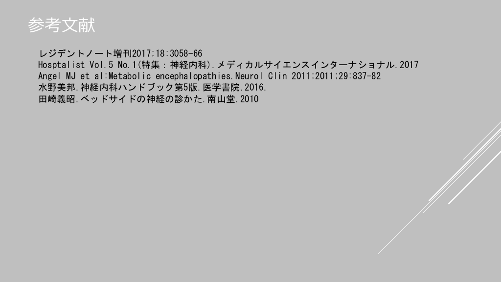 #23. 参考文献 レジデントノート増刊2017;18:3058-66 Hosptalist Vol.5 No.1(特集:神経内科).メディカルサイエンスインターナショナル.2017 Angel MJ et al:Metabolic encephalopathies.Neurol Clin 2011;2011;29:837-82 水野美邦.神経内科ハンドブック第5版.医学書院.2016. 田崎義昭.ベッドサイドの神経の診かた.南山堂.2010