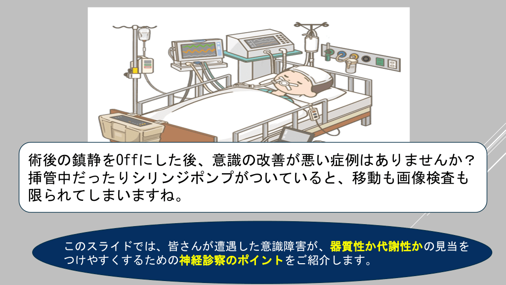 #3. 術後の鎮静をOffにした後、意識の改善が悪い症例はありませんか? 挿管中だったりシリンジポンプがついていると、移動も画像検査も 限られてしまいますね。 このスライドでは、皆さんが遭遇した意識障害が、器質性か代謝性かの見当を つけやすくするための神経診察のポイントをご紹介します。