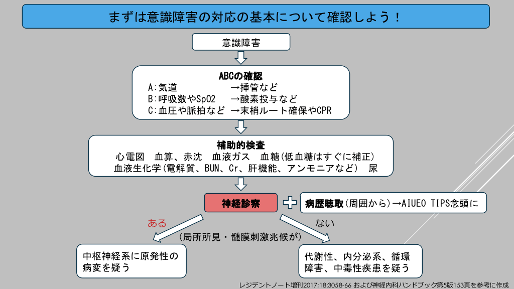 #4. まずは意識障害の対応の基本について確認しよう! 意識障害 ABCの確認 A:気道 →挿管など B:呼吸数やSpO2 →酸素投与など C:血圧や脈拍など →末梢ルート確保やCPR 補助的検査 心電図 血算、赤沈 血液ガス 血糖(低血糖はすぐに補正) 血液生化学(電解質、BUN、Cr、肝機能、アンモニアなど) 尿 神経診察 ある 病歴聴取(周囲から)→AIUEO TIPS念頭に ない (局所所見・髄膜刺激兆候が) 中枢神経系に原発性の 病変を疑う 代謝性、内分泌系、循環 障害、中毒性疾患を疑う レジデントノート増刊2017;18:3058-66 および神経内科ハンドブック第5版153頁を参考に作成