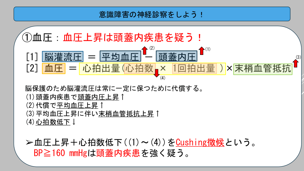 #6. 意識障害の神経診察をしよう! ①血圧:血圧上昇は頭蓋内疾患を疑う! (2) (1) [1] 脳灌流圧 = 平均血圧 - 頭蓋内圧 [2] 血圧 = 心拍出量(心拍数 × 1回拍出量 )×末梢血管抵抗 (4) 脳保護のため脳灌流圧は常に一定に保つために代償する。 (1)頭蓋内疾患で頭蓋内圧上昇↑ (2)代償で平均血圧上昇↑ (3)平均血圧上昇に伴い末梢血管抵抗上昇↑ (4)心拍数低下↓ ➢血圧上昇+心拍数低下((1)~(4))をCushing徴候という。 BP≧160 mmHgは頭蓋内疾患を強く疑う。 (3)