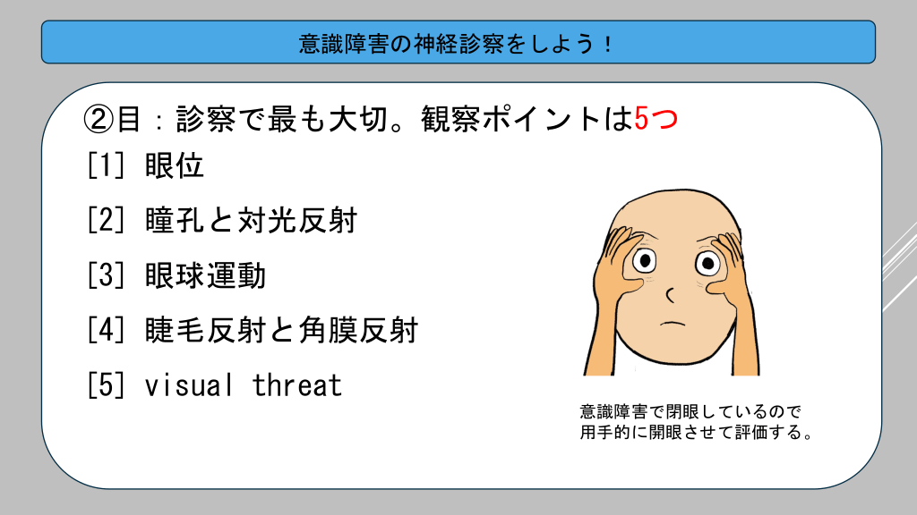 #7. 意識障害の神経診察をしよう! ②目:診察で最も大切。観察ポイントは5つ [1] 眼位 [2] 瞳孔と対光反射 [3] 眼球運動 [4] 睫毛反射と角膜反射 [5] visual threat 意識障害で閉眼しているので 用手的に開眼させて評価する。
