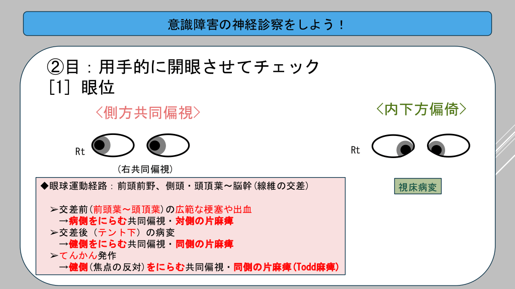 #8. 意識障害の神経診察をしよう! ②目:用手的に開眼させてチェック [1] 眼位 <内下方偏倚> <側方共同偏視> Rt Rt (右共同偏視) ◆眼球運動経路:前頭前野、側頭・頭頂葉~脳幹(線維の交差) ➢交差前(前頭葉~頭頂葉)の広範な梗塞や出血 →病側をにらむ共同偏視・対側の片麻痺 ➢交差後(テント下)の病変 →健側をにらむ共同偏視・同側の片麻痺 ➢てんかん発作 →健側(焦点の反対)をにらむ共同偏視・同側の片麻痺(Todd麻痺) 視床病変