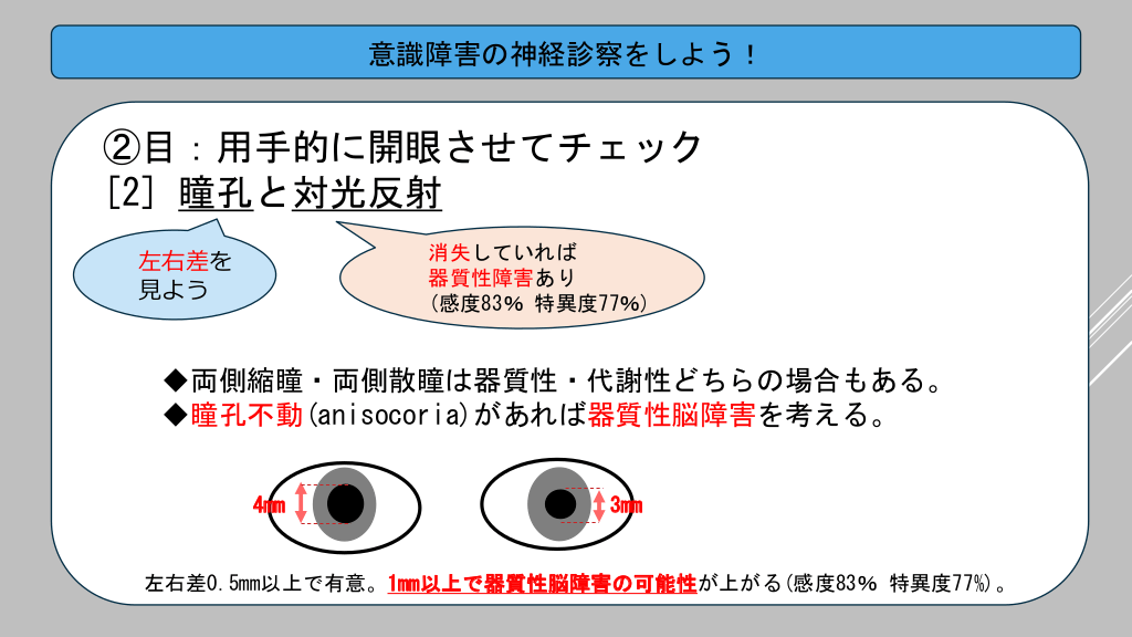 #9. 意識障害の神経診察をしよう! ②目:用手的に開眼させてチェック [2] 瞳孔と対光反射 消失していれば 器質性障害あり (感度83% 特異度77%) 左右差を 見よう ◆両側縮瞳・両側散瞳は器質性・代謝性どちらの場合もある。 ◆瞳孔不動(anisocoria)があれば器質性脳障害を考える。 4mm 3mm 左右差0.5mm以上で有意。1mm以上で器質性脳障害の可能性が上がる(感度83% 特異度77%)。