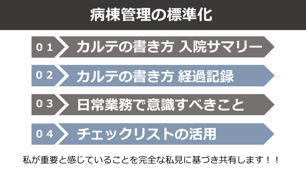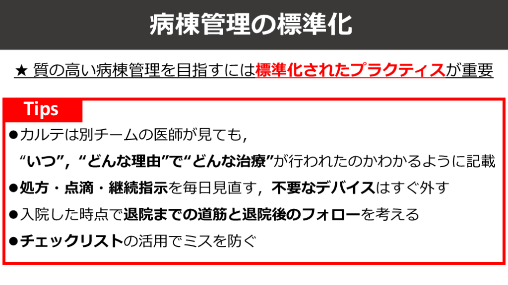 質の高い病棟管理を目指すにはある程度標準化されたプラクティスが必要だと考えています.特にカルテの書き方や,日常業務におけるチェックリストの活用は質を担保する上で非常に重要です.しかし,カルテは個人差が大きく,指導される内容もバラバラで,わかりにくいカルテが連発されているのが現状です.また,不必要な継続指示が残っていたり,余計なデバイスがついていたり,無目的な輸液・処方のdo処方がされていたりすることも多々見受けます.今回は,最低限,カルテや日々の業務の質を維持できるように個人的な型・チェックリストを共有します.