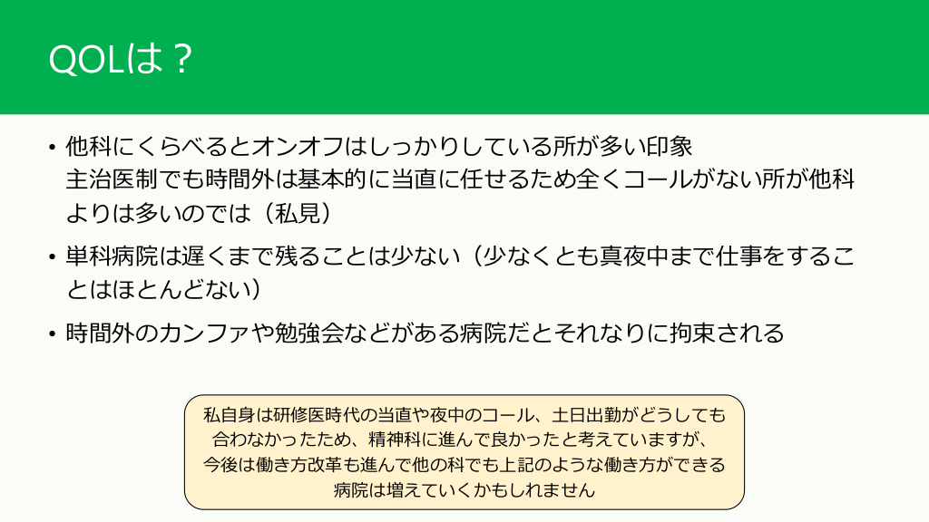 #10. QOLは? • 他科にくらべるとオンオフはしっかりしている所が多い印象 主治医制でも時間外は基本的に当直に任せるため全くコールがない所が他科 よりは多いのでは(私見) • 単科病院は遅くまで残ることは少ない(少なくとも真夜中まで仕事をするこ とはほとんどない) • 時間外のカンファや勉強会などがある病院だとそれなりに拘束される 私自身は研修医時代の当直や夜中のコール、土日出勤がどうしても 合わなかったため、精神科に進んで良かったと考えていますが、 今後は働き方改革も進んで他の科でも上記のような働き方ができる 病院は増えていくかもしれません