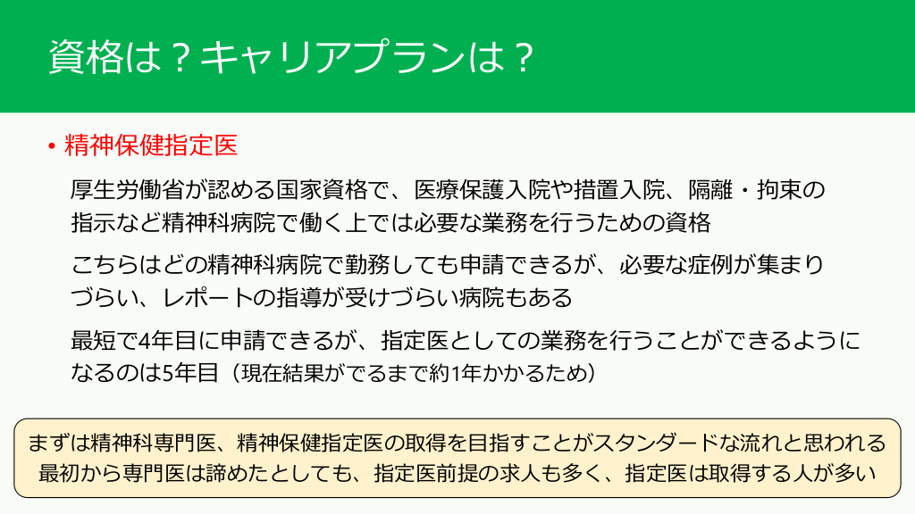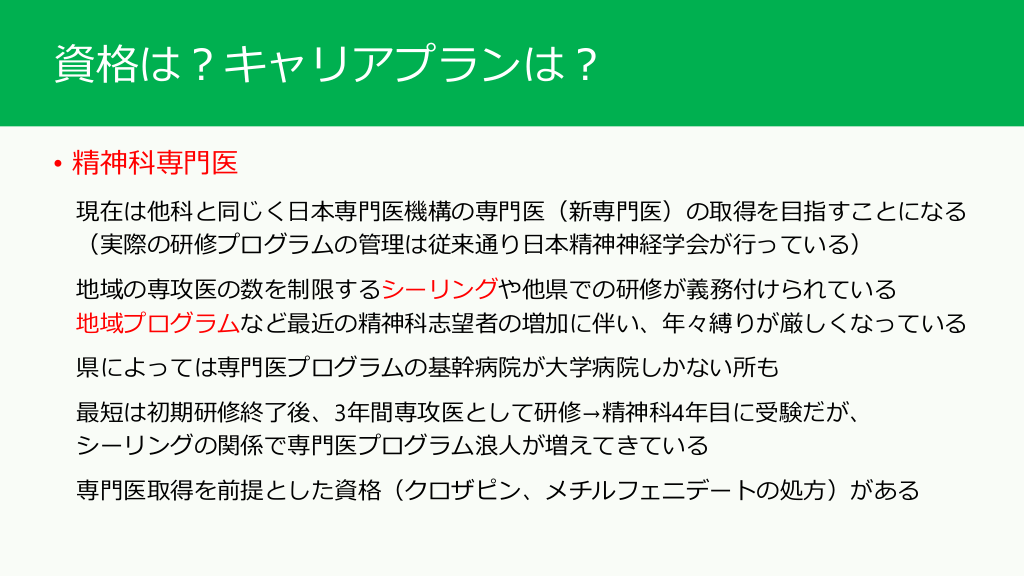 #11. 資格は?キャリアプランは? • 精神科専門医 現在は他科と同じく日本専門医機構の専門医(新専門医)の取得を目指すことになる (実際の研修プログラムの管理は従来通り日本精神神経学会が行っている) 地域の専攻医の数を制限するシーリングや他県での研修が義務付けられている 地域プログラムなど最近の精神科志望者の増加に伴い、年々縛りが厳しくなっている 県によっては専門医プログラムの基幹病院が大学病院しかない所も 最短は初期研修終了後、3年間専攻医として研修→精神科4年目に受験だが、 シーリングの関係で専門医プログラム浪人が増えてきている 専門医取得を前提とした資格(クロザピン、メチルフェニデートの処方)がある