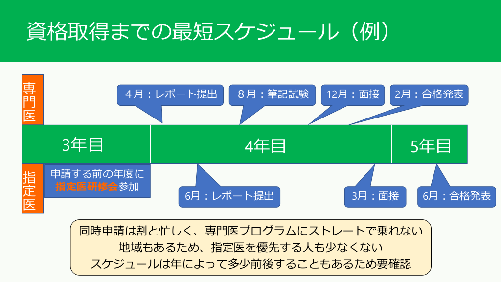 #13. 資格取得までの最短スケジュール(例) 専 門 医 4月:レポート提出 3年目 指 定 医 申請する前の年度に 指定医研修会参加 8月:筆記試験 12月:面接 2月:合格発表 4年目 6月:レポート提出 5年目 3月:面接 6月:合格発表 同時申請は割と忙しく、専門医プログラムにストレートで乗れない 地域もあるため、指定医を優先する人も少なくない スケジュールは年によって多少前後することもあるため要確認