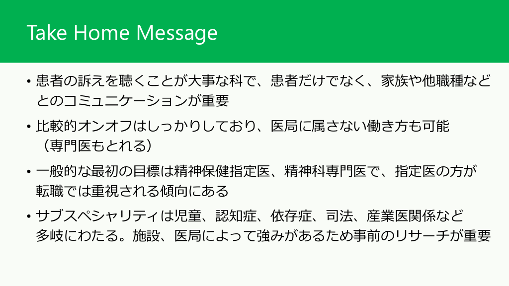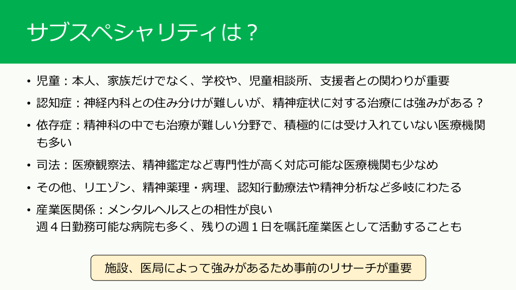 精神科のサブスペシャリティと重要なメッセージ