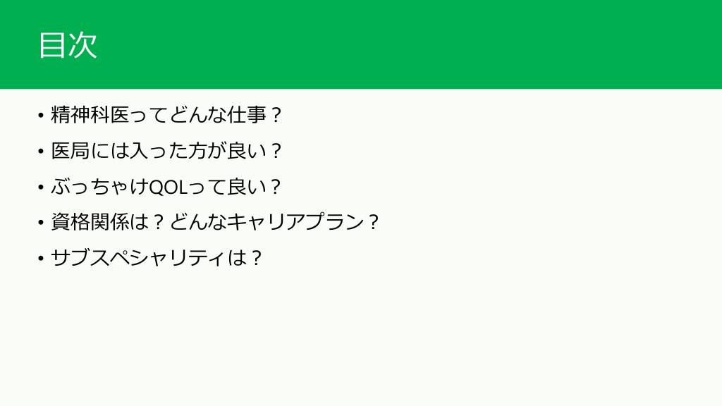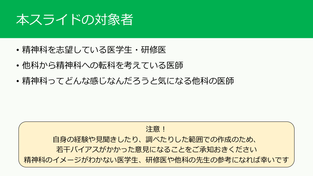 #2. 本スライドの対象者 • 精神科を志望している医学生・研修医 • 他科から精神科への転科を考えている医師 • 精神科ってどんな感じなんだろうと気になる他科の医師 注意! 自身の経験や見聞きしたり、調べたりした範囲での作成のため、 若干バイアスがかかった意見になることをご承知おきください 精神科のイメージがわかない医学生、研修医や他科の先生の参考になれば幸いです