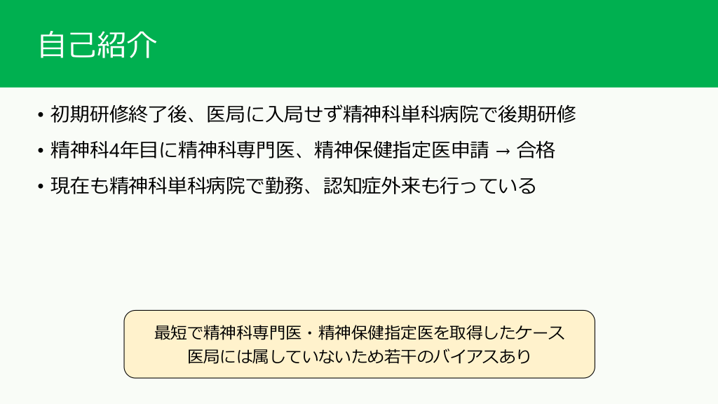 #3. 自己紹介 • 初期研修終了後、医局に入局せず精神科単科病院で後期研修 • 精神科4年目に精神科専門医、精神保健指定医申請 → 合格 • 現在も精神科単科病院で勤務、認知症外来も行っている 最短で精神科専門医・精神保健指定医を取得したケース 医局には属していないため若干のバイアスあり
