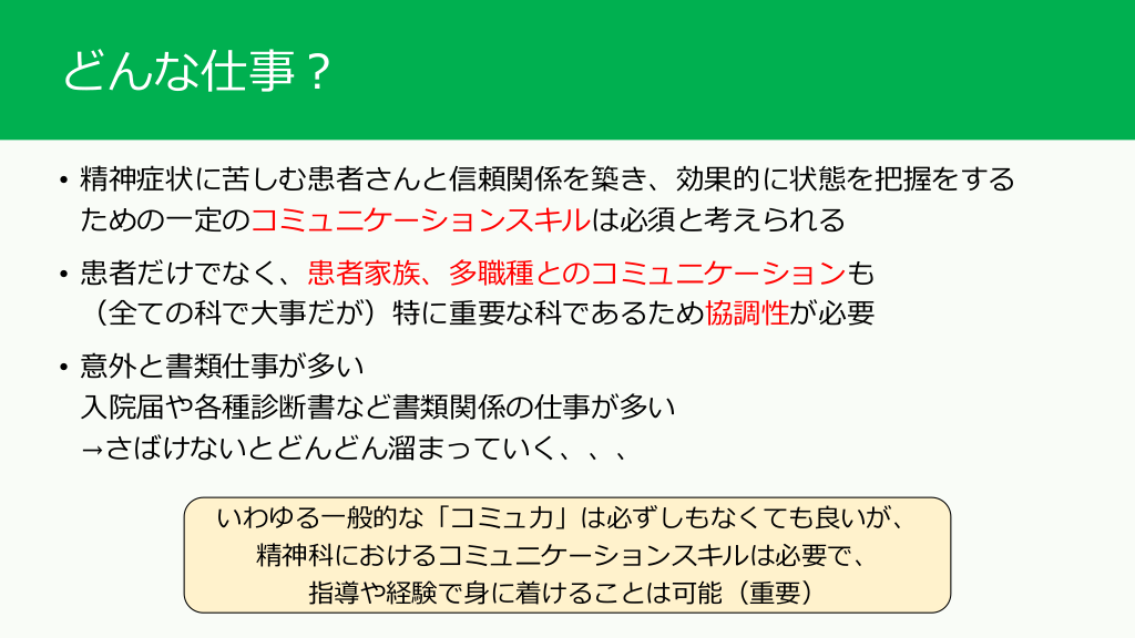 #6. どんな仕事? • 精神症状に苦しむ患者さんと信頼関係を築き、効果的に状態を把握をする ための一定のコミュニケーションスキルは必須と考えられる • 患者だけでなく、患者家族、多職種とのコミュニケーションも (全ての科で大事だが)特に重要な科であるため協調性が必要 • 意外と書類仕事が多い 入院届や各種診断書など書類関係の仕事が多い →さばけないとどんどん溜まっていく、、、 いわゆる一般的な「コミュ力」は必ずしもなくても良いが、 精神科におけるコミュニケーションスキルは必要で、 指導や経験で身に着けることは可能(重要)