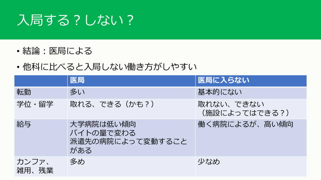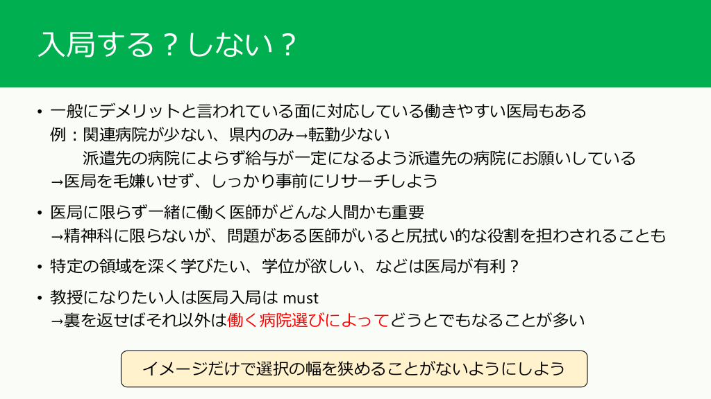 #8. 入局する?しない? • 一般にデメリットと言われている面に対応している働きやすい医局もある 例:関連病院が少ない、県内のみ→転勤少ない 派遣先の病院によらず給与が一定になるよう派遣先の病院にお願いしている →医局を毛嫌いせず、しっかり事前にリサーチしよう • 医局に限らず一緒に働く医師がどんな人間かも重要 →精神科に限らないが、問題がある医師がいると尻拭い的な役割を担わされることも • 特定の領域を深く学びたい、学位が欲しい、などは医局が有利? • 教授になりたい人は医局入局は must →裏を返せばそれ以外は働く病院選びによってどうとでもなることが多い イメージだけで選択の幅を狭めることがないようにしよう