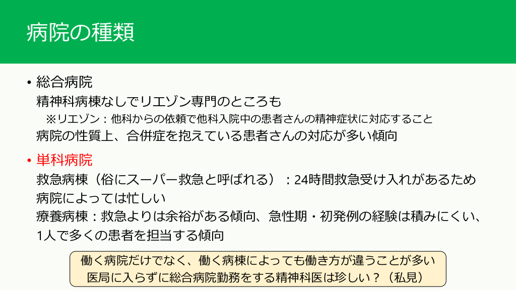 #9. 病院の種類 • 総合病院 精神科病棟なしでリエゾン専門のところも ※リエゾン:他科からの依頼で他科入院中の患者さんの精神症状に対応すること 病院の性質上、合併症を抱えている患者さんの対応が多い傾向 • 単科病院 救急病棟(俗にスーパー救急と呼ばれる):24時間救急受け入れがあるため 病院によっては忙しい 療養病棟:救急よりは余裕がある傾向、急性期・初発例の経験は積みにくい、 1人で多くの患者を担当する傾向 働く病院だけでなく、働く病棟によっても働き方が違うことが多い 医局に入らずに総合病院勤務をする精神科医は珍しい?(私見)