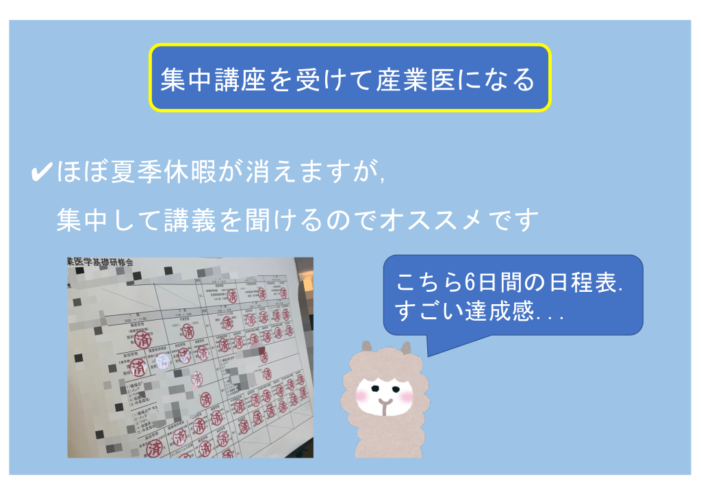 #10. 集中講座を受けて産業医になる ✔産業医科大学が主催 ✔産業医大(夏季)か東京(秋)の集中講座 ✔6日間で50単位が終了👍 「が,しかし」6日間ほぼ全日程,講義(実習)👎 ✔毎年倍率が高く,申し込み開始数分で終了することも ✔講習終了後,5年間のうち1回だけ日医認定の申請可 集中講座だけだと修了証のみで,申請すれば認定書がもらえる. 修了書の提出と1万円追加費用あり.