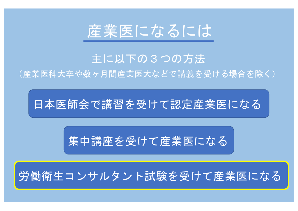 #9. 産業医になるには 主に以下の3つの方法 (産業医科大卒や数ヶ月間産業医大などで講義を受ける場合を除く) 日本医師会で講習を受けて認定産業医になる 集中講義を受けて産業医になる 労働衛生コンサルタント試験を受けて産業医になる
