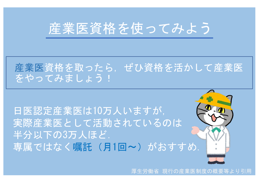 #3. 医師免許に追加して取れる資格 ずばり, 産業医の資格 です. もちろん,他にも各科専門医や Ph.D.(医学博士),MBA(経営学博士) 医師プラス〇〇資格はたくさんありますが, 今回は産業医の資格をピックアップします.