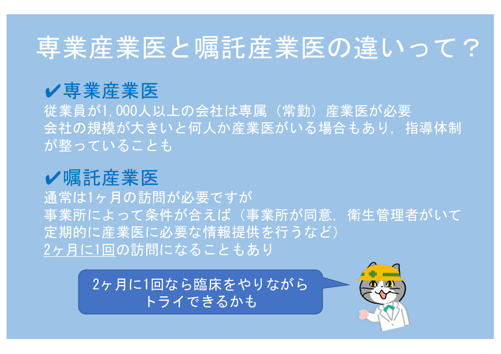 #15. 専業産業医と嘱託産業医の違いって? ✔専業産業医 従業員が1,000人以上の会社は専属(常勤)産業医が必要 会社の規模が大きいと何人か産業医がいる場合もあり,指導体制 が整っていることも ✔嘱託産業医 通常は1ヶ月の訪問が必要ですが 事業所によって条件が合えば(事業所が同意,衛生管理者がいて 定期的に産業医に必要な情報提供を行うなど) 2ヶ月に1回の訪問になることもあり 2ヶ月に1回なら臨床をやりながら トライできるかも