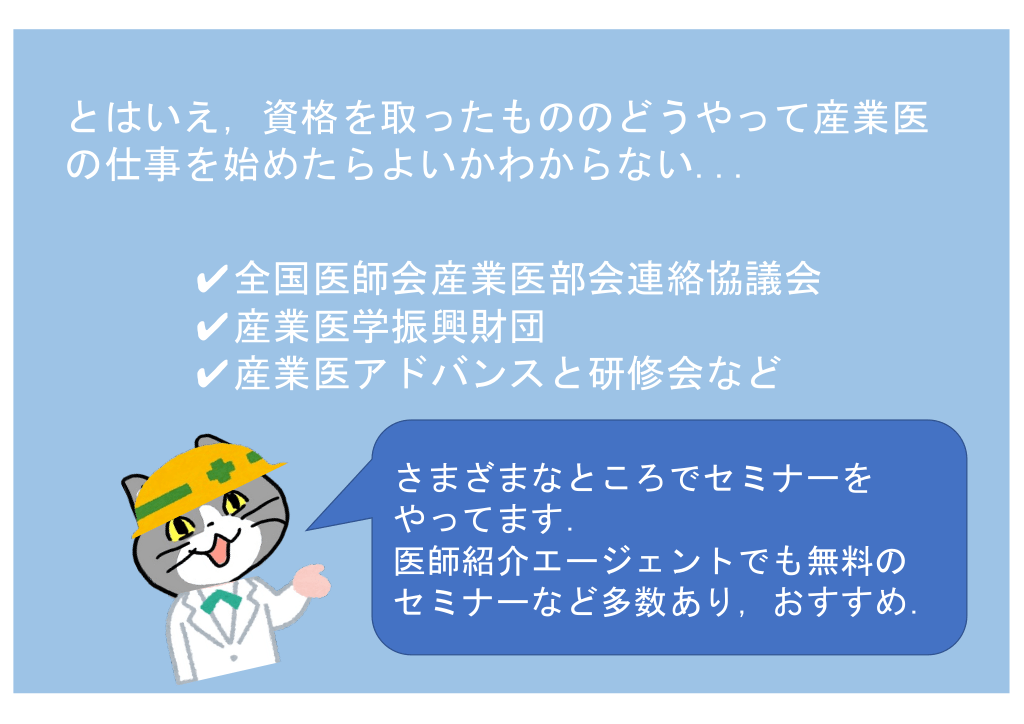 #16. とはいえ,資格を取ったもののどうやって産業医 の仕事を始めたらよいかわからない... ✔全国医師会産業医部会連絡協議会 ✔産業医学振興財団 ✔産業医アドバンスと研修会など さまざまなところでセミナーを やってます. 医師紹介エージェントでも無料の セミナーなど多数あり,おすすめ.