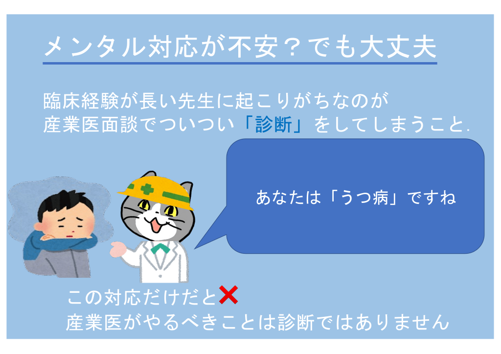 #17. メンタル対応が不安?でも大丈夫 臨床経験が長い先生に起こりがちなのが 産業医面談でついつい「診断」をしてしまうこと. あなたは「うつ病」ですね この対応だけだと❌ 産業医がやるべきことは診断ではありません