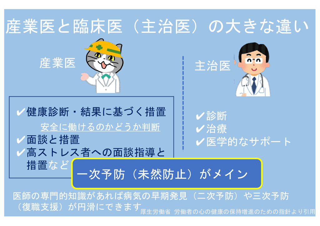 #18. 産業医と臨床医(主治医)の大きな違い 産業医 主治医 ✔健康診断・結果に基づく措置 安全に働けるのかどうか判断 ✔面談と措置 ✔高ストレス者への面談指導と 措置など ✔診断 ✔治療 ✔医学的なサポート 一次予防(未然防止)がメイン 医師の専門的知識があれば病気の早期発見(二次予防)や三次予防 (復職支援)が円滑にできます厚生労働省 労働者の心の健康の保持増進のための指針より引用