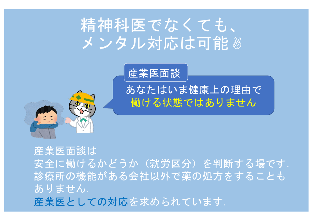 #19. 精神科医でなくても、 メンタル対応は可能✌ 産業医面談 あなたはいま健康上の理由で 働ける状態ではありません 産業医面談は 安全に働けるかどうか(就労区分)を判断する場です. 診療所の機能がある会社以外で薬の処方をすることも ありません. 産業医としての対応を求められています.
