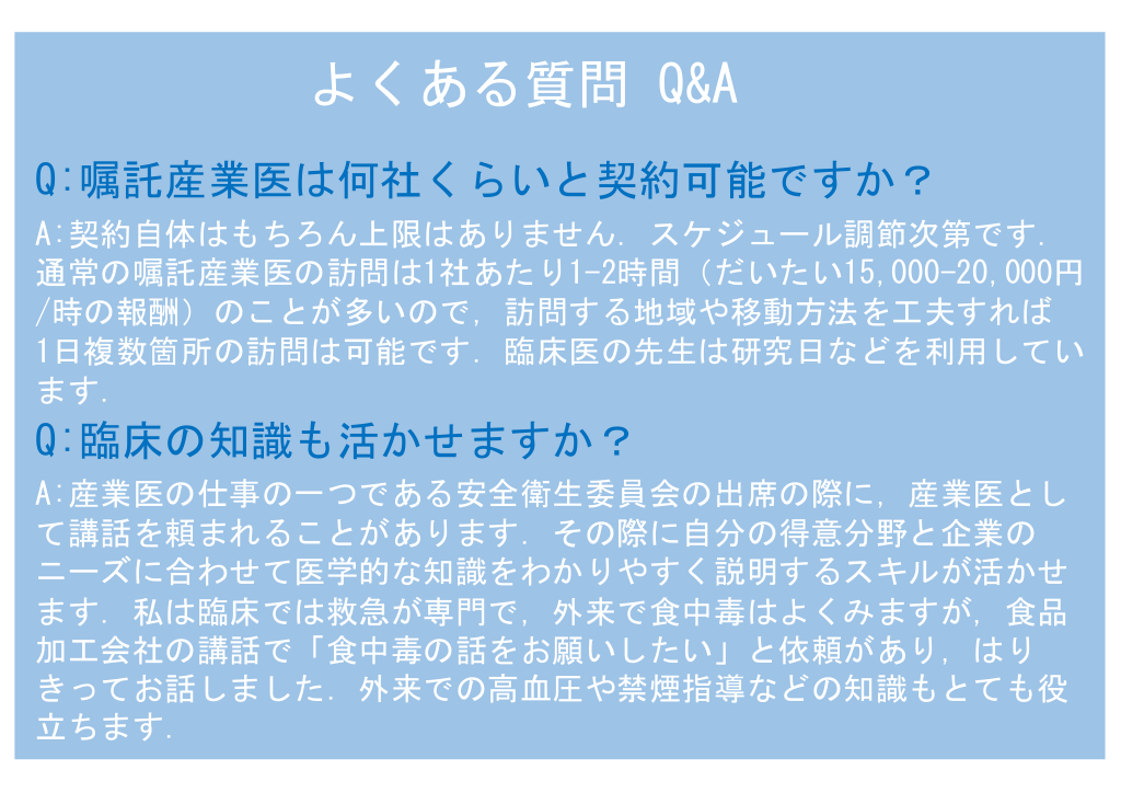 #22. よくある質問 Q&A Q:嘱託産業医は何社くらいと契約可能ですか? A:契約自体はもちろん上限はありません.スケジュール調節次第です. 通常の嘱託産業医の訪問は1社あたり1-2時間(だいたい15,000-20,000円 /時の報酬)のことが多いので,訪問する地域や移動方法を工夫すれば 1日複数箇所の訪問は可能です.臨床医の先生は研究日などを利用してい ます. Q:臨床の知識も活かせますか? A:産業医の仕事の一つである安全衛生委員会の出席の際に,産業医とし て講話を頼まれることがあります.その際に自分の得意分野と企業の ニーズに合わせて医学的な知識をわかりやすく説明するスキルが活かせ ます.私は臨床では救急が専門で,外来で食中毒はよくみますが,食品 加工会社の講話で「食中毒の話をお願いしたい」と依頼があり,はり きってお話しました.外来での高血圧や禁煙指導などの知識もとても役 立ちます.