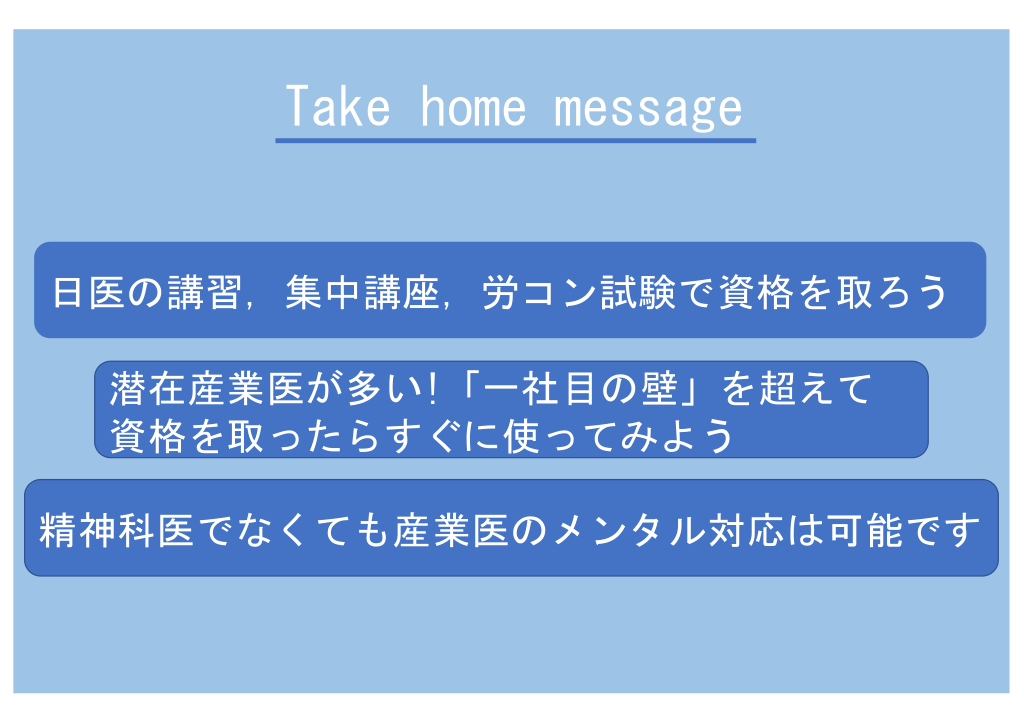 #23. Take home message 日医の講習,集中講座,労コン試験で資格を取ろう 潜在産業医が多い!「一社目の壁」を超えて 資格を取ったらすぐに使ってみよう 精神科医でなくても産業医のメンタル対応は可能です