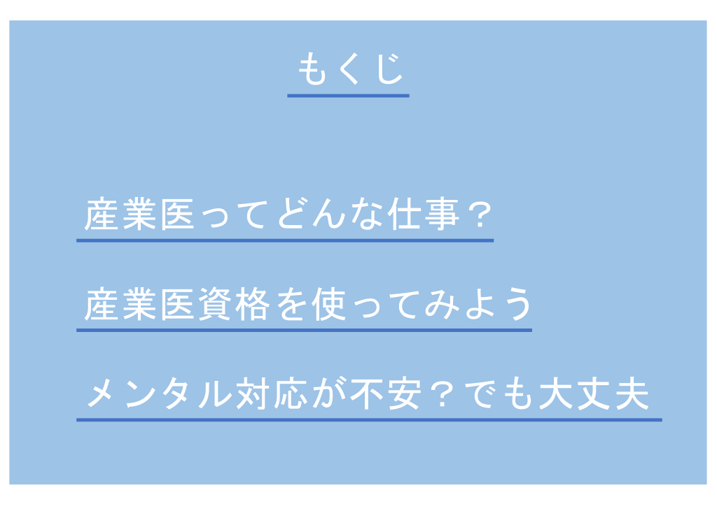 #4. もくじ 産業医ってどんな仕事? 産業医資格を使ってみよう メンタル対応が不安?でも大丈夫