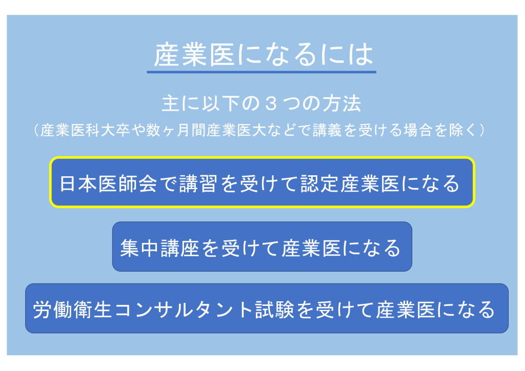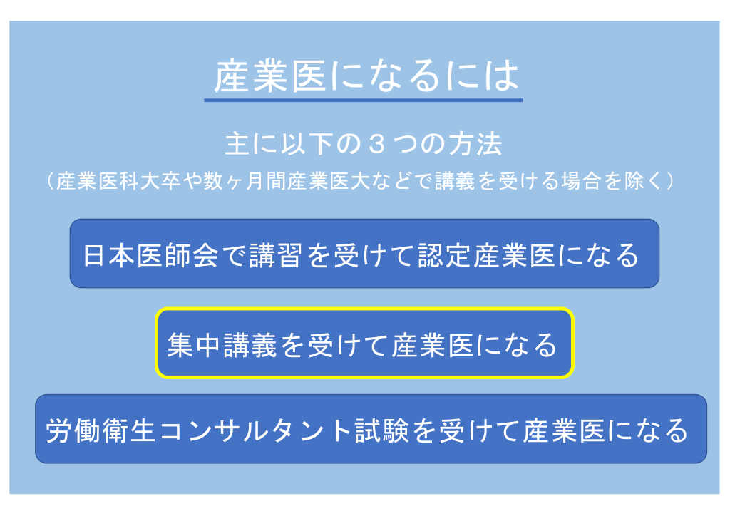 #6. 産業医になるには 主に以下の3つの方法 (産業医科大卒や数ヶ月間産業医大などで講義を受ける場合を除く) 日本医師会で講習を受けて認定産業医になる 集中講座を受けて産業医になる 労働衛生コンサルタント試験を受けて産業医になる