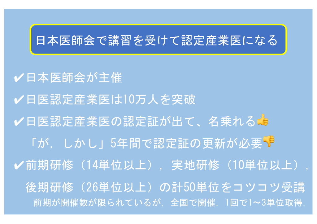 #7. 日本医師会で講習を受けて認定産業医になる ✔日本医師会が主催 ✔日医認定産業医は10万人を突破 ✔日医認定産業医の認定証が出て、名乗れる👍 「が,しかし」5年間で認定証の更新が必要👎 ✔前期研修(14単位以上),実地研修(10単位以上), 後期研修(26単位以上)の計50単位をコツコツ受講 前期が開催数が限られているが,全国で開催.1回で1〜3単位取得.
