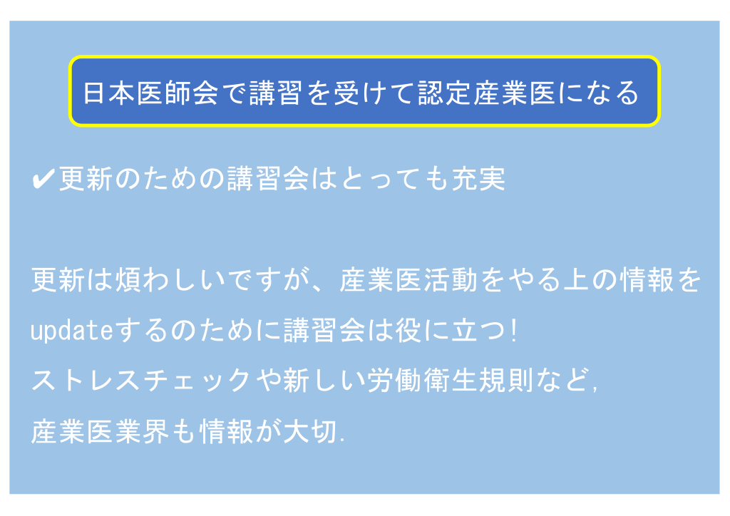 #8. 日本医師会で講習を受けて認定産業医になる ✔更新のための講習会はとっても充実 更新は煩わしいですが、産業医活動をやる上の情報を updateするのために講習会は役に立つ! ストレスチェックや新しい労働衛生規則など, 産業医業界も情報が大切.