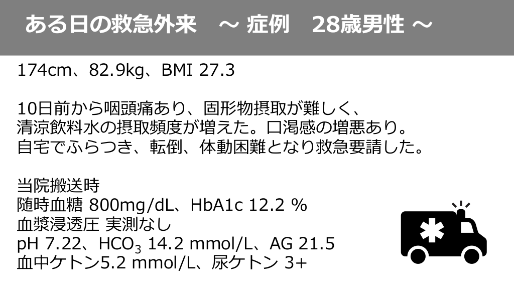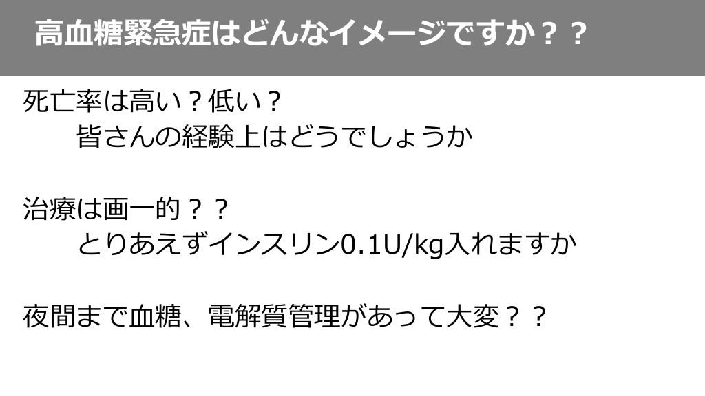 型通りの高血糖緊急症レクチャー、スライドではなく、日常臨床にすぐに落とし込めるに意識してスライド作成しております。