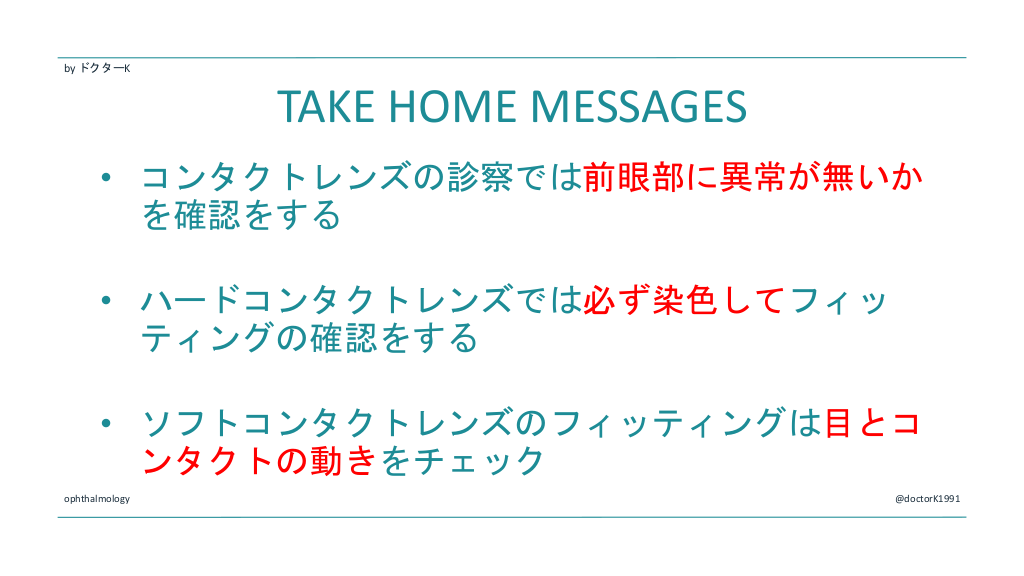 #2. by ドクターK TAKE HOME MESSAGES • コンタクトレンズの診察では前眼部に異常が無いか を確認をする • ハードコンタクトレンズでは必ず染色してフィッ ティングの確認をする • ソフトコンタクトレンズのフィッティングは目とコ ンタクトの動きをチェック ophthalmology @doctorK1991