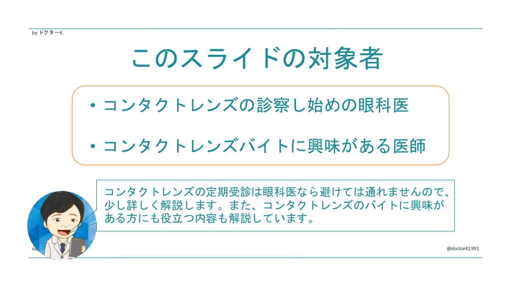 #3. by ドクターK このスライドの対象者 • コンタクトレンズの診察し始めの眼科医 • コンタクトレンズバイトに興味がある医師 コンタクトレンズの定期受診は眼科医なら避けては通れませんので、 少し詳しく解説します。また、コンタクトレンズのバイトに興味が ある方にも役立つ内容も解説しています。 ophthalmology @doctorK1991