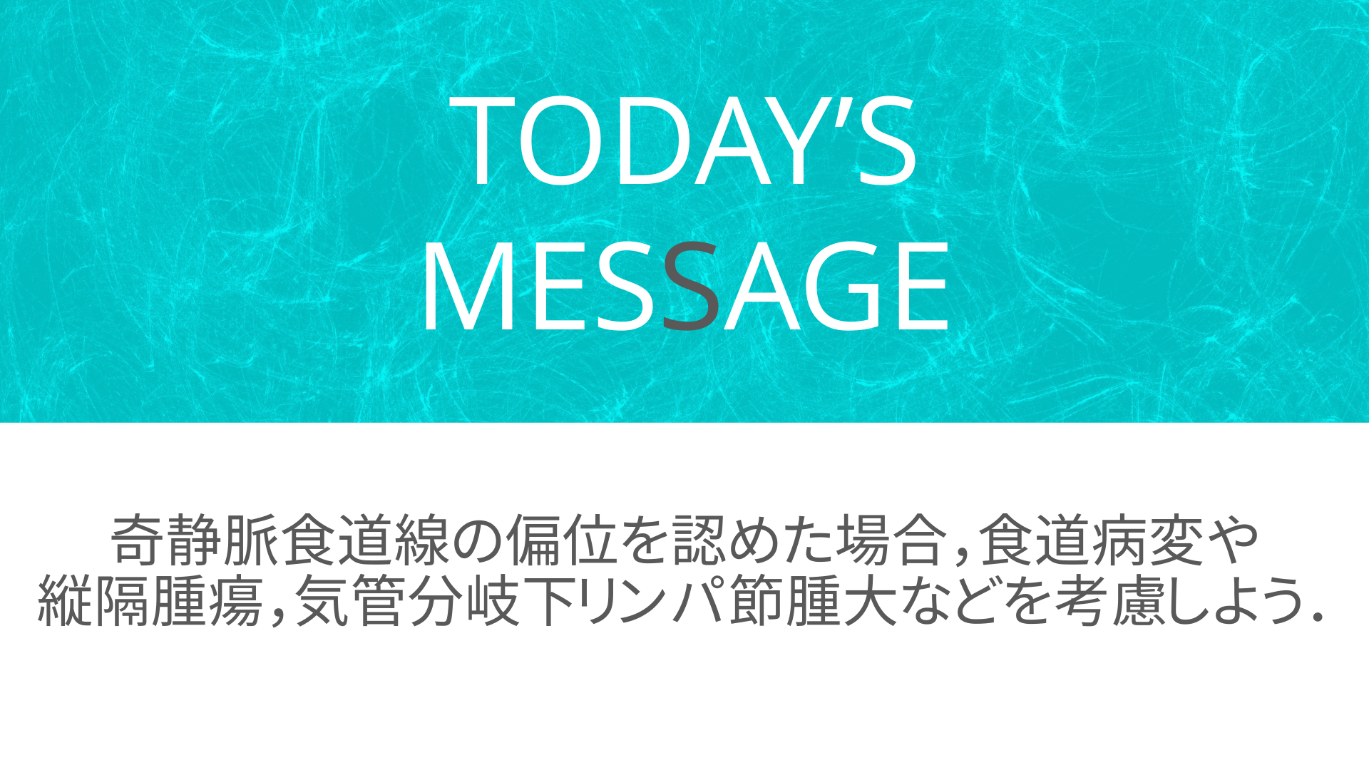 #41. TODAY’S MESSAGE 奇静脈食道線の偏位を認めた場合,食道病変や 縦隔腫瘍,気管分岐下リンパ節腫大などを考慮しよう.