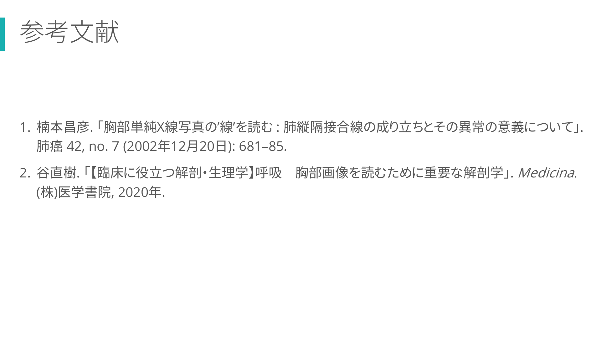 #43. 参考文献 1. 楠本昌彦. 「胸部単純X線写真の’線’を読む : 肺縦隔接合線の成り立ちとその異常の意義について」. 肺癌 42, no. 7 (2002年12月20日): 681–85. 2. 谷直樹. 「【臨床に役立つ解剖・生理学】呼吸 (株)医学書院, 2020年. 胸部画像を読むために重要な解剖学」. Medicina.