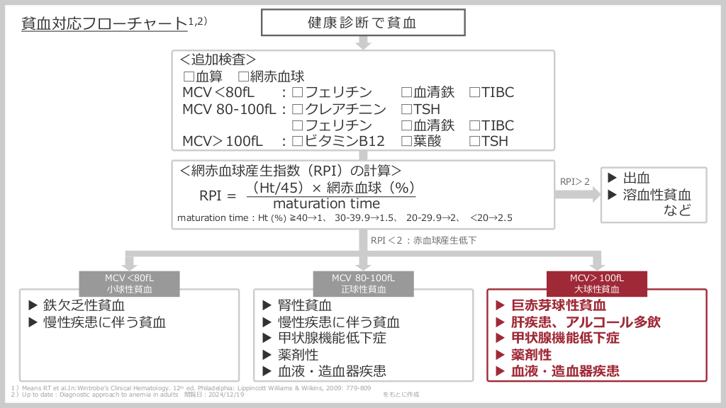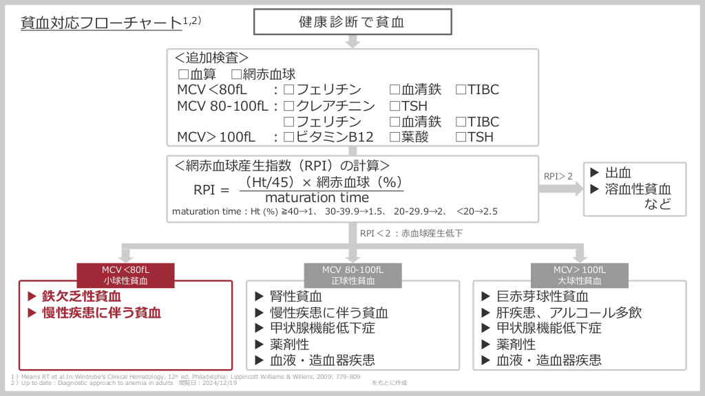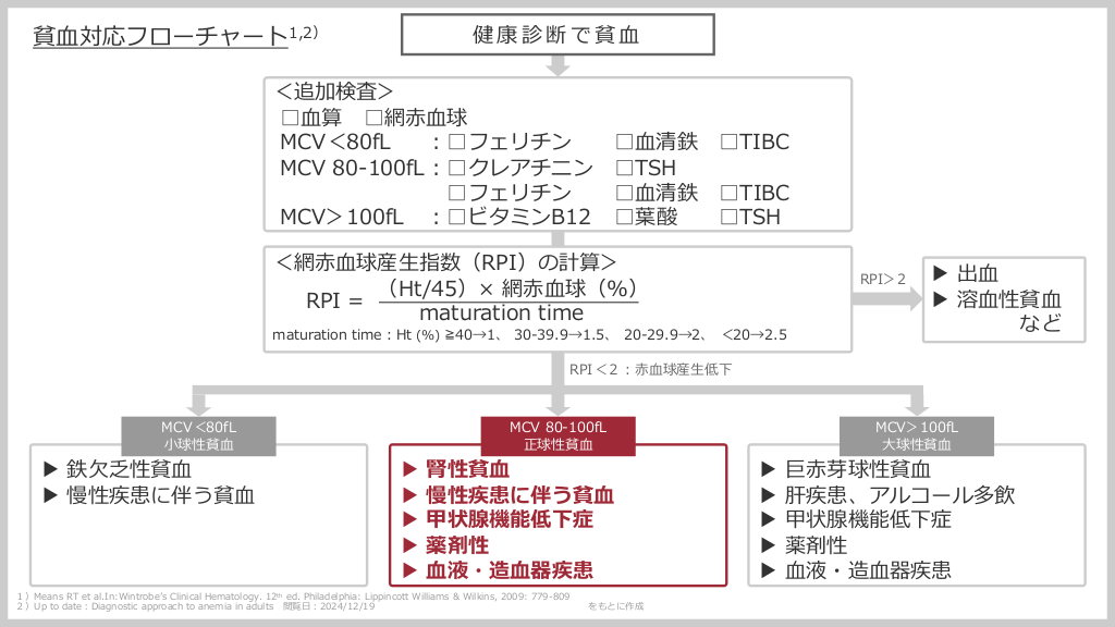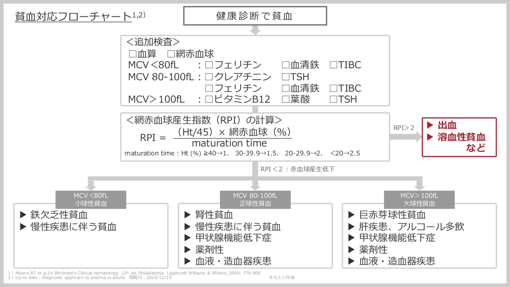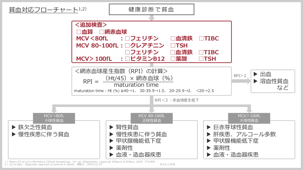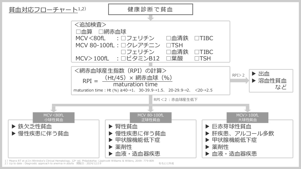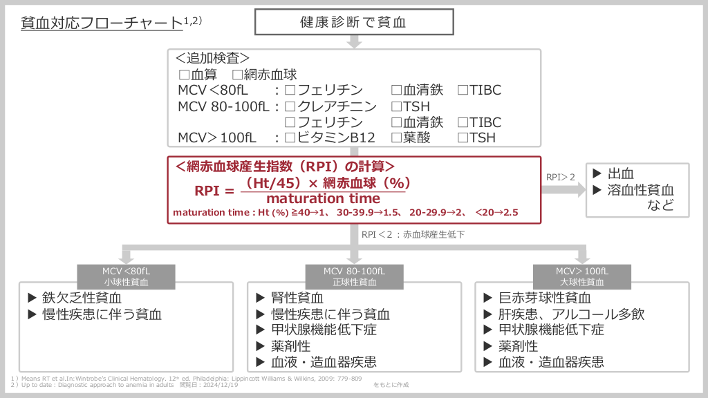 #2. 健康診断で貧⾎ 貧⾎対応フローチャート1,2) <追加検査> □⾎算 □網⾚⾎球 MCV<80fL ︓□フェリチン □⾎清鉄 □TIBC MCV 80-100fL︓□クレアチニン □TSH □フェリチン □⾎清鉄 □TIBC MCV>100fL ︓□ビタミンB12 □葉酸 □TSH <網⾚⾎球産⽣指数(RPI)の計算> (Ht/45)× 網⾚⾎球(%) RPI = maturation time RPI>2 maturation time︓Ht (%) ≧40→1、 30-39.9→1.5、 20-29.9→2、 <20→2.5 ▶ 出⾎ ▶ 溶⾎性貧⾎ など RPI<2︓⾚⾎球産⽣低下 MCV<80fL ⼩球性貧⾎ ▶ 鉄⽋乏性貧⾎ ▶ 慢性疾患に伴う貧⾎ ▶ ▶ ▶ ▶ ▶ MCV 80-100fL 正球性貧⾎ 腎性貧⾎ 慢性疾患に伴う貧⾎ 甲状腺機能低下症 薬剤性 ⾎液・造⾎器疾患 1)Means RT et al.In:Wintrobeʼs Clinical Hematology. 12th ed. Philadelphia: Lippincott Williams & Wilkins, 2009: 779-809 2)Up to date︓Diagnostic approach to anemia in adults 閲覧⽇︓2024/12/19 をもとに作成 ▶ ▶ ▶ ▶ ▶ MCV>100fL ⼤球性貧⾎ 巨⾚芽球性貧⾎ 肝疾患、アルコール多飲 甲状腺機能低下症 薬剤性 ⾎液・造⾎器疾患