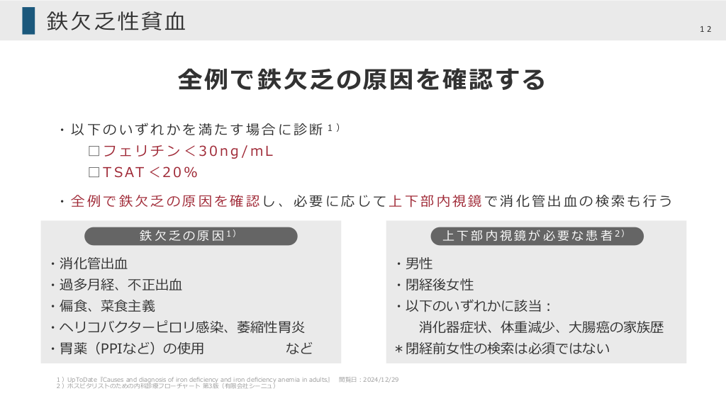 #12. 鉄⽋乏性貧⾎ 12 全例で鉄⽋乏の原因を確認する ・ 以 下 の い ず れ か を 満 た す 場 合 に 診 断 1) □フェリチン<30ng /mL □ T S AT < 2 0 % ・全例で鉄⽋乏の原因を確認し、必要に応じて上下部内視鏡で消化管出⾎の検索も⾏う 鉄 ⽋ 乏 の 原 因 1) 上 下 部 内 視 鏡 が 必 要 な 患 者 2) ・消化管出⾎ ・男性 ・過多⽉経、不正出⾎ ・閉経後⼥性 ・偏⾷、菜⾷主義 ・以下のいずれかに該当︓ ・ヘリコバクターピロリ感染、萎縮性胃炎 ・胃薬(PPIなど)の使⽤ など 1)UpToDate『Causes and diagnosis of iron deficiency and iron deficiency anemia in adults』 2)ホスピタリストのための内科診療フローチャート 第3版(有限会社シーニュ) 消化器症状、体重減少、⼤腸癌の家族歴 *閉経前⼥性の検索は必須ではない 閲覧⽇︓2024/12/29