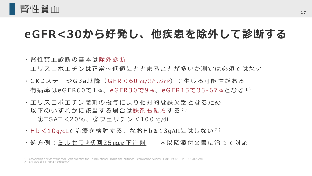 #17. 腎性貧⾎ 17 eGFR<30から好発し、他疾患を除外して診断する ・腎性貧⾎診断の基本は除外診断 エリスロポエチンは正常〜低値にとどまることが多いが測定は必須ではない ・ C K D ス テ ー ジ G 3 a 以 降 ( G F R < 6 0 mL/分/1.73m2) で ⽣ じ る 可 能 性 が あ る 有 病 率 は e G F R 6 0 で 1 % 、 e G F R 3 0 で 9 % 、 e G F R 1 5 で 3 3 - 6 7 % と な る 1) ・エリスロポエチン製剤の投与により相対的な鉄⽋乏となるため 以 下 の い ず れ か に 該 当 す る 場 合 は 鉄 剤 も 処 ⽅ す る 2) ① T S A T < 2 0 % 、 ② フ ェ リ チ ン < 1 0 0 ng/dL ・ H b < 1 0 g/dLで 治 療 を 検 討 す る 、 な お H b ≧ 1 3 g/dLに は し な い 2 ) ・ 処 ⽅ 例 ︓ ミ ル セ ラ ® 初 回 2 5 μg⽪ 下 注 射 *以降添付⽂書に沿って対応 1)Association of kidney function with anemia: the Third National Health and Nutrition Examination Survey (1988-1994) PMID︓12076240 2)CKD診療ガイド2024(東京医学社)